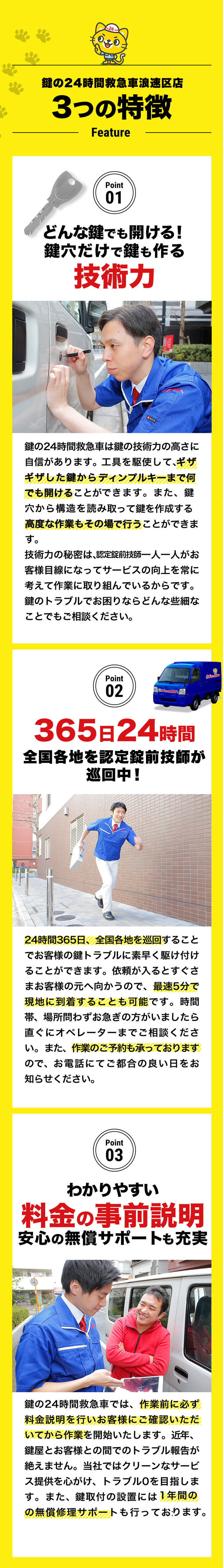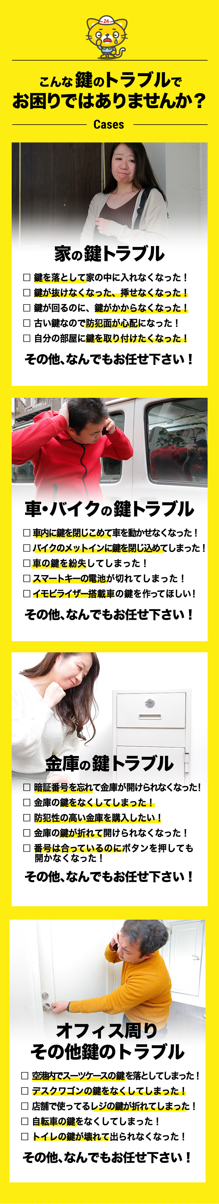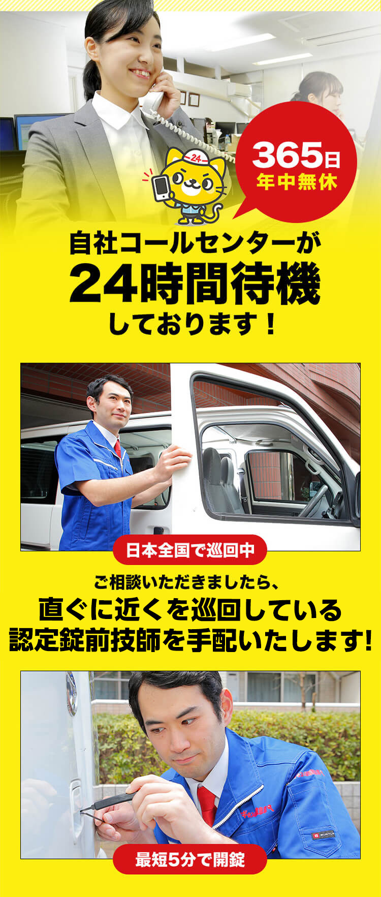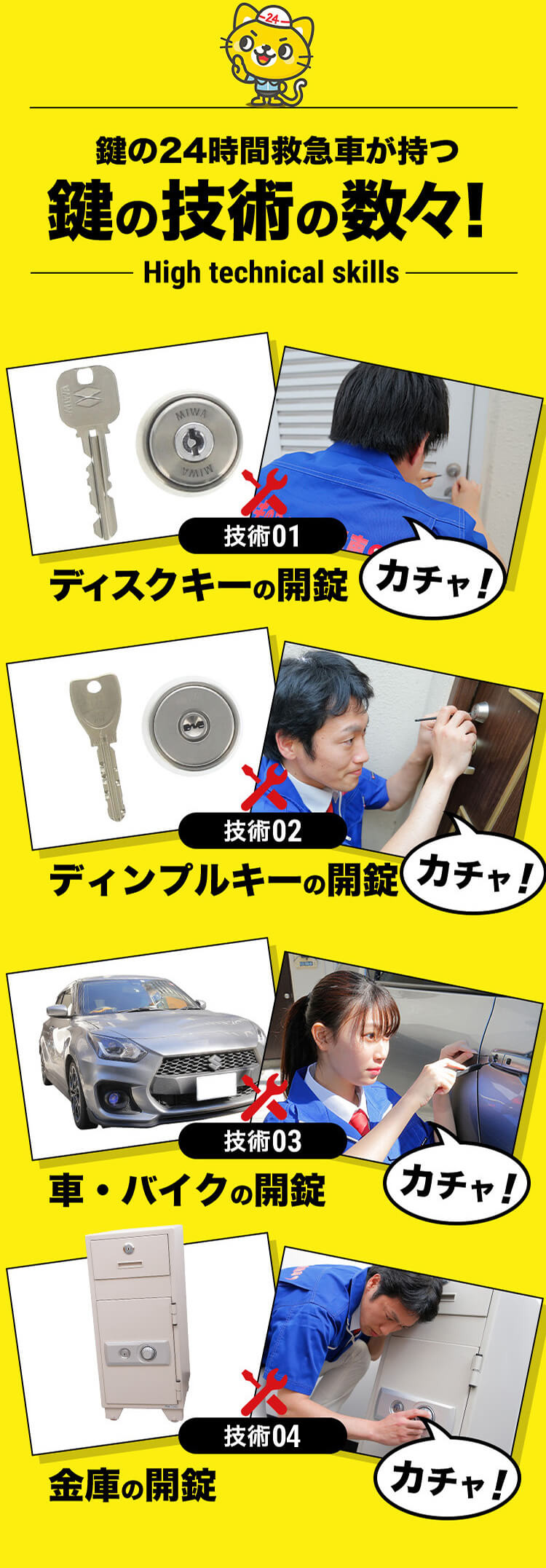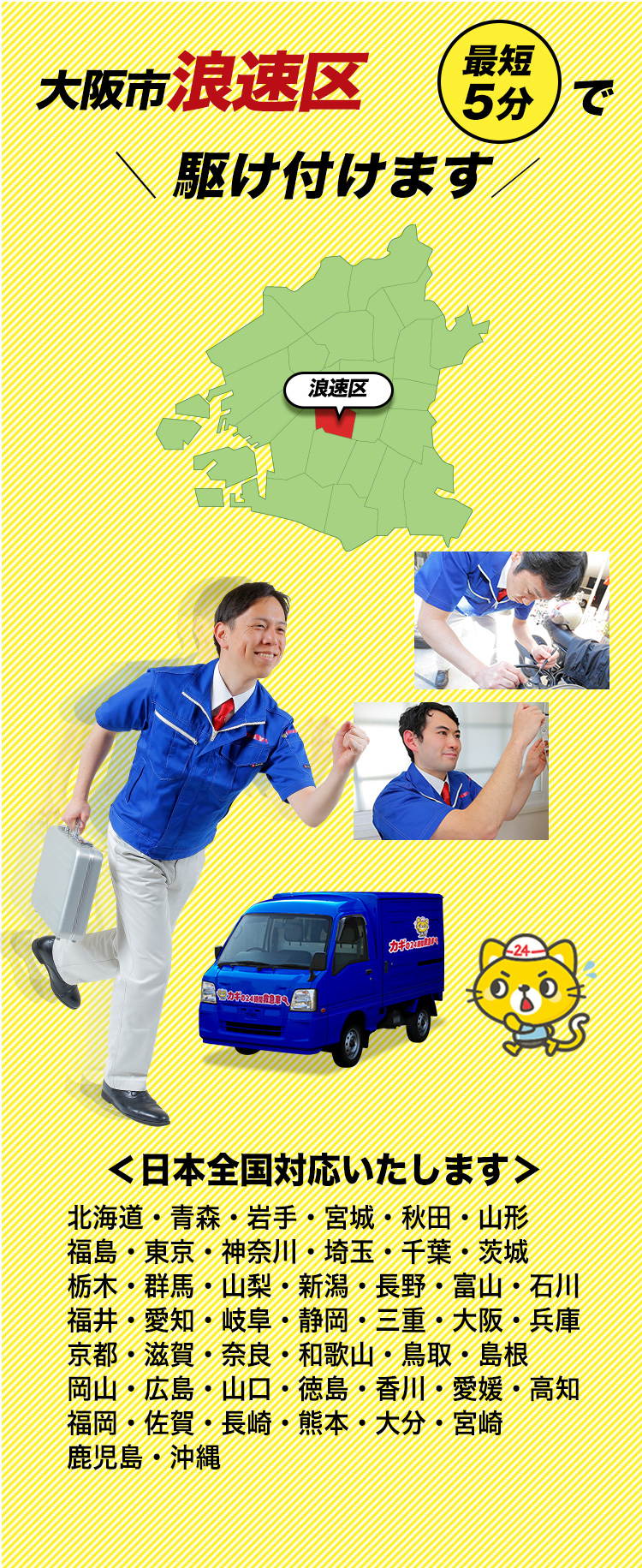 浪速区の「カギの出張24時間」は、なんば、日本橋エリアで鍵の緊急事態に24時間対応します。迅速なサービスと親切な対応で、地域のお客様から高い評価を得ています。お困りの際はいつでもお呼びください。